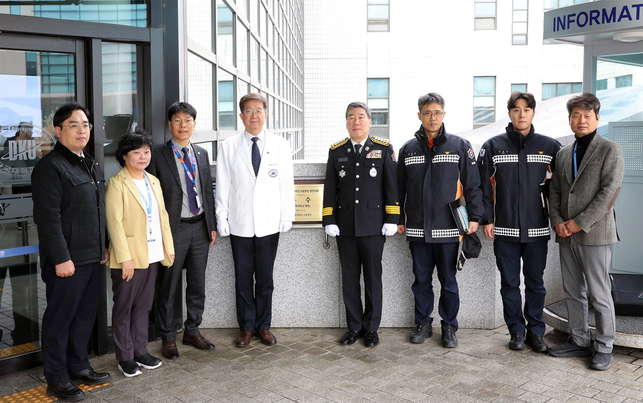 김재일 단국대병원장과 강종범 천안동남소방서장 등이 ‘관계인 소방훈련 경진대회 ‘우수기관 현판식’을 열고 있다. 단국대병원 제공