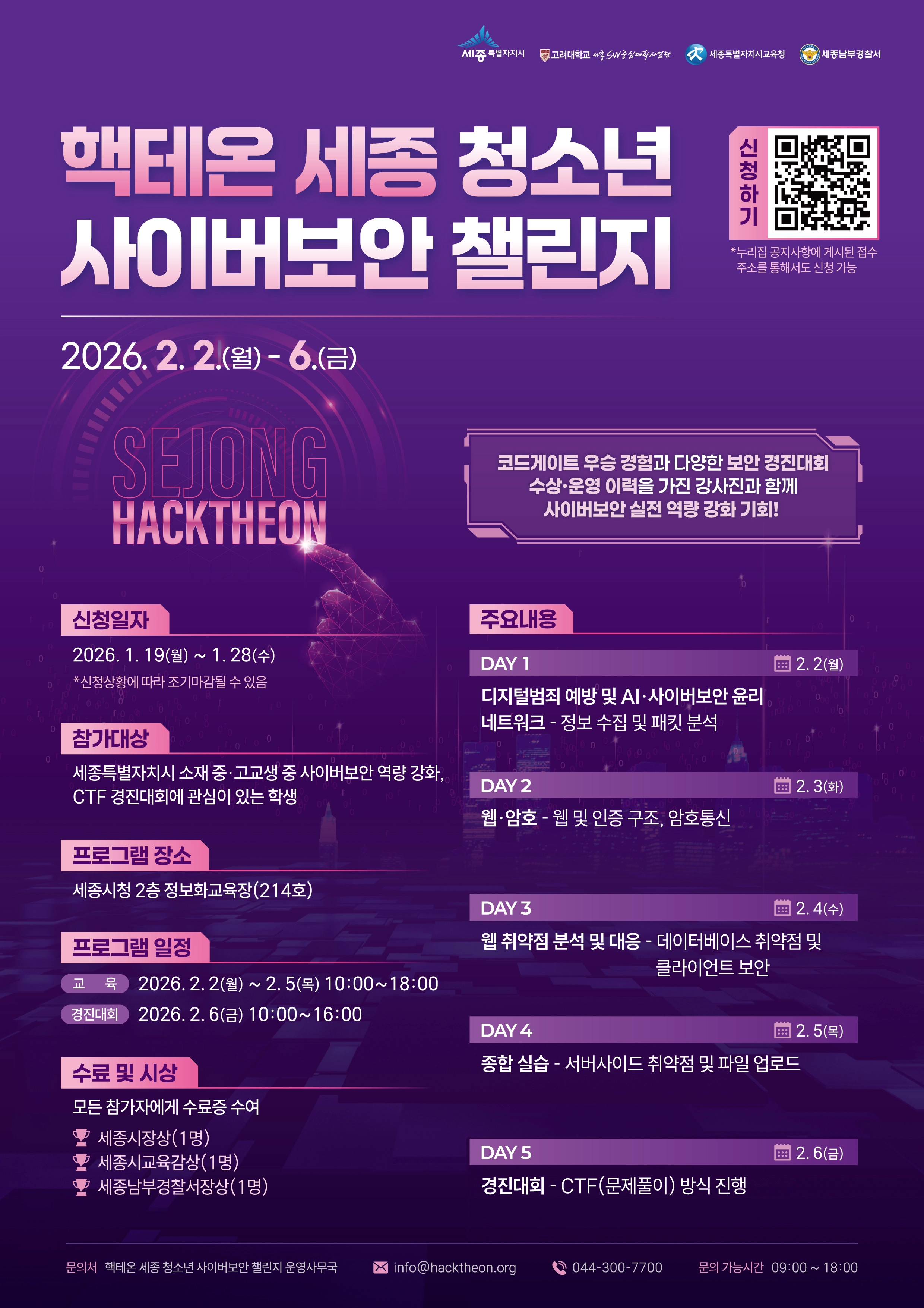 21일 세종시에 따르면 28일까지 관내 중고등학생을 대상으로 핵테온 세종 청소년 사이버보안 챌린지 참가자를 모집한다.