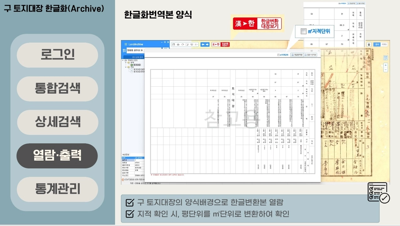 도는 4년에 걸쳐 일제강점기 작성된 313만 6000장의 토지대장을 한글로 변환하고 디지털화했다. 기록물 노후화·훼손 문제 해소와 한자·일본식 표기로 인한 도민 불편 개선을 위해서다.
