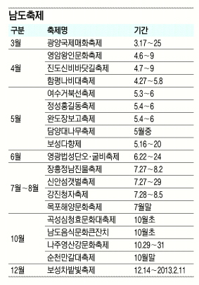 전통의 축제들은 잇따라 축포를 준비하고 있다. 남도 축제가 봄 소식을 제일 먼저 알린다. 전남 광양매화축제가 17일 테이프를 끊고 9일간 열린다. 남도 축제는 전남 22개 시·군의 독특한 자연환경과 역사적 사건·지역 특산물 등을 소재로 다채롭게 펼쳐져 맛깔난다. 이어 22~25일 구례산수유꽃축제가 열리고 다음 달 진도 신비 바닷길축제, 함평 나비대축제 등이 잇따라 열려 상춘객들을 유혹한다.
