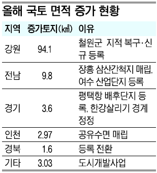 국토 면적이 증가한 주된 요인은 미등록 토지의 등록이나 토지대장 복구, 경계 정정 등이다. 올해에는 철원군 DMZ의 토지대장 복구와 신규 등록으로 무려 94.1㎢가 늘었다.
