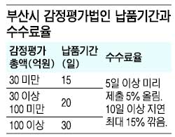 앞으로 이런 일이 사라질 전망이다. 부산시건설본부는 감정평가 수수료율을 납품기일에 따라 탄력 적용하는 등의 내용을 담은 ‘감정평가 선진화 시책’을 시행한다고 30일 밝혔다.