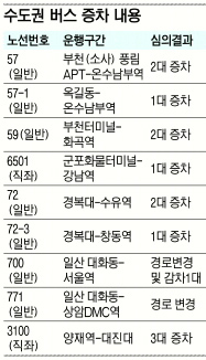 예컨대 경복대~수유역을 오가는 72번 버스와 부천터미널~화곡역을 오가는 59번 버스의 운행 대수는 2대씩 늘어난다. 대신 일산 대화동~서울역을 오가는 700번 버스는 운행 대수를 1대 줄이고 경로도 일부 변경된다.
