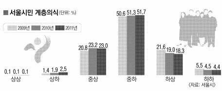 서울시가 시민들이 느끼는 삶의 질 등 전반적 사회상을 파악해 16일 발표한 ‘2011 서울서베이 도시정책지표조사’ 결과에 따르면 응답자의 51.7%는 자신이 중하층에 속한다고 생각했다. 조사는 지난해 11월 한달간 15세 이상 성인 4만 5605명 및 거주 외국인 2500명, 사업체 5500곳을 대상으로 방문면접을 통해 실시됐다.