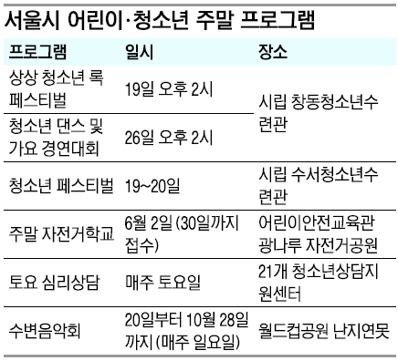 서울시는 어린이와 청소년들에게 다양한 체험활동의 기회를 제공하기 위해 활기차고 재밌는 주말 프로그램을 마련했다고 18일 밝혔다. 학생들이 학교생활에 적응하는 데 도움이 되는 토요 심리 상담 프로그램도 운영된다.