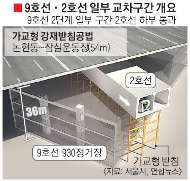 서울 지하철 9호선의 일부 구간이 지하철 2호선의 하부 구간을 통과한다.서울시는 9호선 2단계(논현동∼잠실종합운동장) 공사의 최대 난공사 구간인 2호선 잠실운동장역 하부 통과 구간의 토공 굴착을 지난달 초 완료하고 현재 구조물 공사를 하고 있다고 11일 밝혔다. 국내에서 처음 시도한 이 공사는 2호선 54m 구간을 신공법인 ‘가교형 강재받침공법’을 적용해 지하철 박스 구조물과 같은 대형 시설물을 강재로 받쳐 운행 중인 2호선을 안전하게 보호하면서 지하 36m 바닥까지 굴착해 9호선 ‘930 정거장’ 구조물을 설치하는 것이다.<그림>