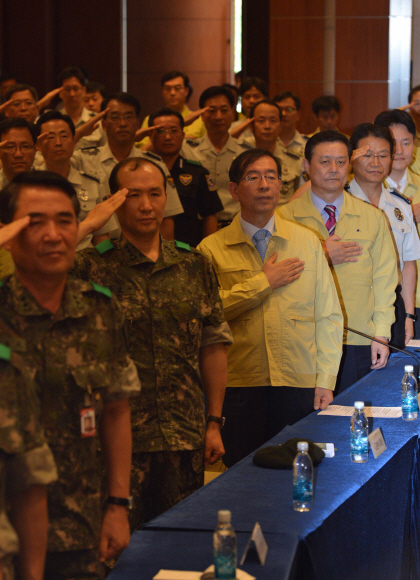 14일 서울 효창동 백범기념관에서 열린 서울시 통합방위회의에서 박원순(앞줄 왼쪽 세번째) 서울시장 등 참석자들이 국기에 대한 경례를 하고 있다.