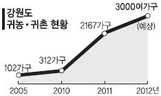 강원도와 국회 농림수산식품위원회는 15일 농업을 목적으로 강원 농촌지역으로 이주하는 가구 수가 지난 2005년 102가구에서 지난해 2167가구로 급격히 늘어나는 등 가파른 상승세를 보이며 전국 최고의 귀농 귀촌지역으로 떠오르고 있다고 밝혔다. 올해는 3000가구가 입주하고 오는 2022년에는 10만여명의 도시인들이 강원 농촌지역으로 몰려 올 것으로 예상되고 있다.