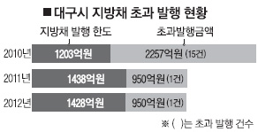 당시 2011 세계육상선수권대회를 앞두고 마라톤 코스 정비나 도로 건설 등을 위해 잇따라 지방채를 초과 발행한 데다 도시철도 3호선을 착공하면서 사업비 마련을 위해 1475억원에 이르는 지방채를 발행한 것이다. 지난해와 올해에는 각각 1건만 한도를 초과해 발행했다. 그러나 발행 금액이 950억원씩으로 발행 한도의 3분의2가 넘는 큰 액수였다. 지난해 지방채 발행 한도는 1438억원이었고 올해는 1428억원이다.