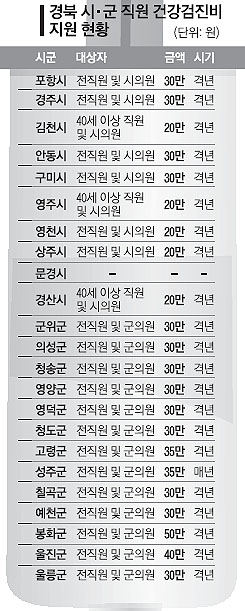 포항시도 올해 직원 1000명의 검진비로 예산 3억원을 확보했다. 여기에는 시의원 35명도 포함됐다. 지난해엔 직원 등 936명의 검진비 2억 7400만원을 시비로 썼다. 영주시는 40세 이상의 직원에 한해 검진비를 준다. 2010년 처음으로 직원 660명에게 검진비 1억 3200만원을 지원했다. 올해는 674명에게 1억 3480만원을 줄 예정이다. 시의원 14명은 올해 처음으로 1인당 20만원씩 받게 된다.