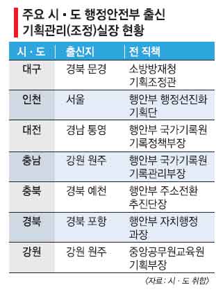30일 전국 광역지자체에 따르면 대부분의 시·도 기획관리실장이 행안부 출신으로 채워져 있다. 이 중 대전시, 충남도, 충북도 등의 기획관리실장은 다른 지역 출신이다. A 자치단체 공무원은 “사업을 구상하고 예산을 집행하는 등 지자체 살림을 총괄하는 자리인데 지역 사정을 몰라 제 역할을 못 한다. 지역 사정을 속속들이 알려면 적어도 반년은 걸릴 텐데 제대로 일이 되겠느냐.”면서 “마음은 콩밭(인사권을 갖고 있는 행안부)에 가 있고, 지자체에 인사권이 없다 보니 오만할 때도 있다.”고 귀띔했다.