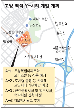 26일 시 관계자에 따르면 일산동구 백석동 1237 일대 11만 1013㎡ 규모의 부지에 2400가구 규모의 주상복합아파트 등이 포함된 Y-시티 개발사업을 추진 중인 요진개발은 지하철 3호선 백석역과 접한 A3지역 7238㎡에 쌍둥이 빌딩을 지어 한 곳은 업무용으로, 나머지 한 곳은 15층 높이의 호텔(비즈니스급)을 지을 예정이다.