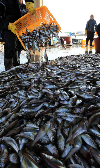 동해안에 도루묵이 풍년인 가운데 30일 강원 고성군 아야진항에서 위판작업이 진행되고 있다.