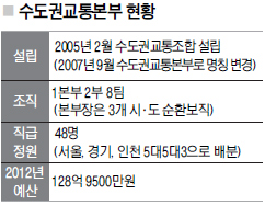 10일 서울 등 3개 시·도에 따르면 2005년 광역버스 노선조정, 간선급행버스(BRT) 사업추진, 교통정책 협의·조정 등을 위해 수도권교통본부를 설립했다. 서울 중구에 있는 수도권교통본부에는 3개 지자체에서 파견 나온 48명(서울 19명, 경기 18명, 인천 11명)의 직원이 근무 중이다. 운영경비도 5대5대3 비율이어서 올해 서울 2억 2100만원, 경기 2억 2100만원, 인천이 1억 3200만원을 충당했다.