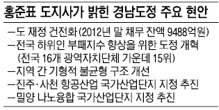 홍 지사는 “현재 경남도 재정 상황이 어려워 정부 예산을 한푼이라도 더 지원받는 것이 시급하기 때문에 이번 주말에는 기획재정부를 비롯한 중앙부처와 국회 등을 방문해 예산 지원과 국가산단 지정 등의 현안에 대한 협조를 요청하겠다.”고 밝혔다. “예산 전문가를 행정부지사로 데려오기 위해 기획재정부 및 행정안전부 장관과 의논해 보겠다.”는 복안도 털어놨다. 홍 지사는 전날 대통령 선거와 함께 실시된 경남도지사 보궐선거에서 119만 1904표(62.91%)를 얻어 70만 2689표(37.08%)를 얻은 무소속 권영길 후보를 48만 9215표(25.83% 포인트) 차이로 누르고 당선됐다.