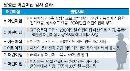 이 같은 사실은 대구시가 최근 대구 달성군에 있는 30개 어린이집에 대해 감사를 벌인 결과 드러났다. 시는 30일 이번 감사에서 40%인 12곳이 불법과 편법으로 지원금을 사용하다 적발됐다고 밝혔다.