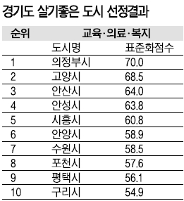 종합평가에서는 도내 31개 시·군 가운데 과천시가 수위였지만 주민의 생활과 직결된 ‘교육·의료·복지’ 부문 평가에서는 의정부시와 고양시가 1, 2위를 차지하는 화려한 성적표를 거머쥐었다. 학원 등 교육시설을 비롯해 보육시설·보건소·병원 수와 사회복지 예산, 노인 복지시설 수 등을 지표로 평가한 결과였다.