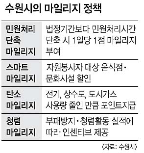 경기 수원시가 마일리지제를 이용한 다양한 정책을 추진해 호응을 얻고 있다. 21일 수원시에 따르면 시가 민원처리단축 마일리지제를 도입한 이후 민원처리기간이 단축되는 등 효과가 큰 것으로 나타났다.