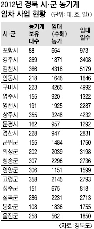 자치단체 보유 농기계는 전체의 1.5%에 그친다. 하지만 한 대를 여러 농가에 빌려주기 때문에 사용 농가는 엄청나게 많다. 경북 시·군의 경우 지난해 농기계 4386대를 연간 3만 8319차례에 걸쳐 총 3만 5178농가에 4만 7374일간 임대해 줬다.