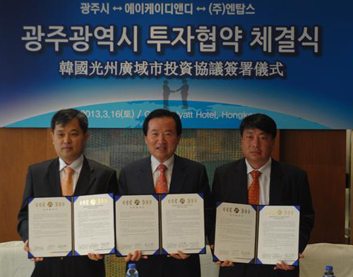 강운태 광주시장을 단장으로 한 투자유치단은 지난 16일 홍콩에서 에이케이 디앤디, 지역의 ㈜엔탑스가 환경설비 제조공장과 관련 연구소 설립을 위해 1억 달러를 투자하는 협약을 이끌어 냈다.