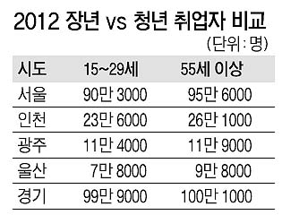 지난해 서울지역 55세 이상 장년층 취업 인구는 95만 6000명으로 15∼29세 청년층 취업자 수 90만 3000명을 앞질렀다. 1989년 통계작성 이래 처음이다. 인천·광주·울산시와 경기도 역시 마찬가지이지만, 수도인 서울이라는 점과 50만명 이상 격차를 보였다는 점에서 의미를 띤다고 전문가들은 입을 모으고 있다. 전국적으로는 2007년부터 장년층 취업자 수가 청년층 취업자 수를 웃돌았다.