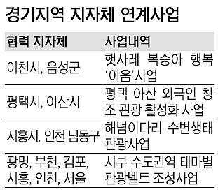 평택시는 온천관광객이 많은 아산시와 함께 평택항을 중심으로 한 문화관광 콘텐츠를 개발하고, 외국인 방문객과 주한 미군 가족들을 위한 전통문화예술 프로그램을 운영할 예정이다. 이천시는 음성군과 함께 공동 브랜드인 햇사레 복숭아를 활용한 특화사업을 추진하고, ‘햇사레복숭아 행복이음단’을 구성해 지역주민 소득 증대 등 공동 발전을 도모할 계획이다. 시흥시는 인천 남동구와 협력해 소래포구와 월곶항의 상생발전 및 배곧신도시 수변공원 이용을 활성화하고, 서해낙조와 수변생태환경을 관광사업과 연계할 계획이다.