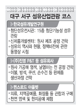 서구는 또 이 관광코스가 학생 교육용으로 적합하다고 보고 시와 시교육청에 현장학습이나 수학여행에 반영하도록 요청했다. 학생들이 “원단 제작과 염색과정 등을 보면서 섬유에 대한 이해가 깊어졌고 섬유가 첨단 분야라는 것도 알게 됐다”고 입을 모아서다.