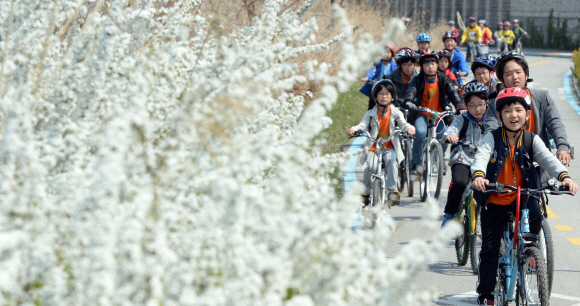 화창한 봄날씨를 보인 26일 서울 한강시민공원 암사나들목 부근에서 강동구 강명초등학교 6학년 학생들이 자전거를 타고 있다. 이 학교는 전교생을 대상으로 자전거타기를 정규 수업과정으로 운영하고 있다.