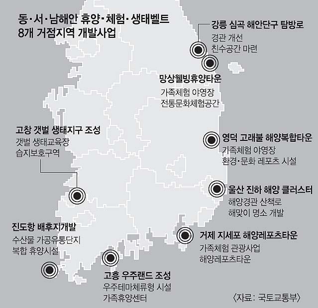 동서남해안 거점 8곳이 휴양·체험·생태벨트로 개발된다.국토교통부는 동서남해안권 발전 종합계획과 ‘낙후지역 휴양·관광벨트 구축’ 사업을 연계한 해안권 개발사업을 본격 추진한다고 8일 밝혔다. 국토부는 8곳 거점지역 개발사업을 올 하반기부터 설계·착공하고 2016년까지 1181억원을 투입하기로 했다.