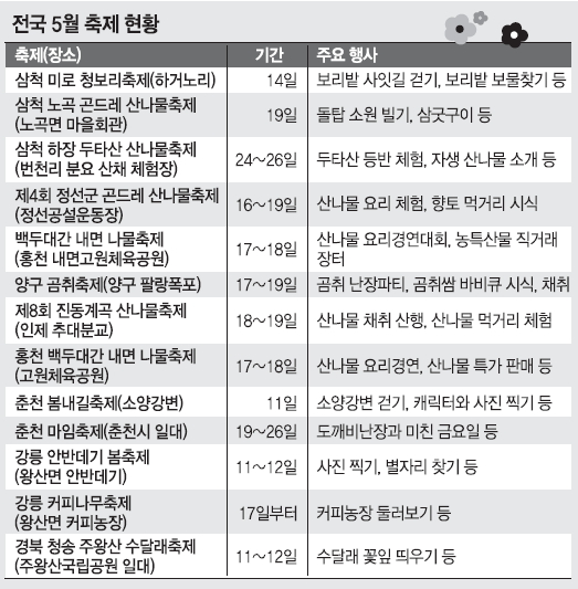 산골짜기마다 봄나물이 흐드러진 5월, 산나물을 테마로 한 축제에서부터 걷기 축제까지 풍성한 축제가 곳곳에서 펼쳐져 도시인들을 유혹한다.