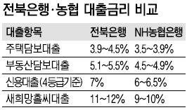 13일 전북은행에 따르면 주택담보대출, 부동산담보대출, 신용대출 등 서민들이 주로 이용하는 대출상품의 금리가 NH농협은행을 비롯한 일반 시중은행보다 0.25~2% 포인트 높은 것으로 나타났다.