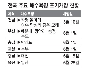경북 포항시는 다음 달 1일 도심에 있는 북부 해수욕장을 조기 개장한다. 예년보다 보름 정도 빠르다. 많은 시민과 관광객이 일찍 찾아온 무더위를 피해 도심 속 해수욕장을 찾을 것으로 예상해서다. 포항시는 15일부터 굴착기와 비치클리너를 투입해 백사장을 정비하고 편의시설 보수와 각종 안내판 정비를 한다. 다른 해수욕장은 다음 달 29일 개장한다. 울산 동구도 일산 해수욕장을 예년보다 10일가량 빠른 다음 달 28일 개장한다. 울주군은 진하 해수욕장을 오는 7월 1일 개장해 8월 31일까지 운영할 예정이다. 충남 대천 해수욕장도 지난해보다 1주일 빠른 다음 달 15일 개장한다. 보령시는 샤워장, 주차장 정비 및 편의 시설 점검 등으로 분주하다. 해수욕장 위의 만남의 광장에 234㎡의 안전구조센터를 신축하고 조형물 설치도 서두르고 있다. 태안군 만리포 해수욕장은 오는 31일 ‘바다의 날’ 행사를 갖고 이튿날인 다음 달 1일 바로 개장한다. 14일 개장했던 지난해보다 2주일 빠르다.