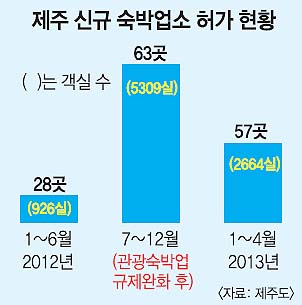 제주도관광협회 관계자는 “중국인 관광객이 폭증하는 데다 관광 성수기에는 방을 구하기 어려운 등 제주의 숙박난은 여전하다”며 “신규 숙박업소가 늘어난다고 무조건 규제하기보다는 정확한 관광 수요 분석과 예측을 통해 대안을 제시해야 할 것”이라고 말했다.