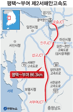 노선은 서해안고속도로 평택 포승지구에서 갈라져 충남 아산 인주를 거쳐 당진~대전고속도로 삽교에서 만난 뒤 서천~공주고속도로 서부여 구간으로 이어지는 왕복 4차로다. 총 길이는 86.3㎞, 사업비는 2조 2457억원이다. 제2서해안 고속도로가 완공되면 충남의 대표 낙후지역인 청양·부여군이 수도권과 직접 연결돼 개발 효과가 커지고 현 서해안고속도로의 교통체증을 대폭 해소할 것으로 기대된다. 서해안고속도로는 주말 하루 9만여대의 차량이 통행하면서 평택 구간과 서해대교 등에서 극심한 교통 체증이 빚어지고 있다.