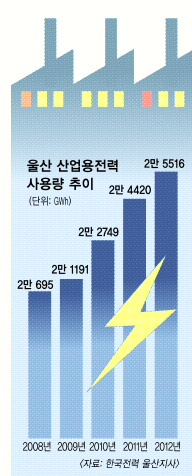 한전 울산지사에 따르면 울산의 산업용 전력 사용량은 2008년 2만 695GWh에서 지난해 2만 5516GWh로 5년 사이 4821GWh 증가했고, 같은 기간 전기 사용료도 1조 2630억원에서 2조 2160억원으로 9530억원 늘었다.