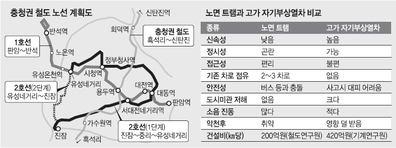 ‘노면(面)’과 ‘고가(高架)’.요즘 대전도시철도 2호선 건설방식을 놓고 벌어지고 있는 갈등의 핵심이다. 대전시는 도로 위에 고가 철로를 설치해 자기부상열차를, 시민단체는 기존 시내 도로에 레일을 깔아 트램(전차)을 운행하자고 맞서고 있다. 정부가 재정부담을 들어 지하철을 허용하지 않는 상태에서 양쪽은 한 치의 양보도 없다.