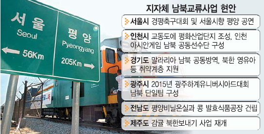 인천시는 개성공단 폐쇄 등 모든 남북관계가 단절된 상태에서도 중국 단둥(丹東)에 북한 근로자 28명을 고용해 축구화 공장을 운영함으로써 남북협력의 끈을 이어 왔다. 시는 중·장기적으로 강화군 교동도에 남북이 함께하는 평화산업단지를 조성, 개성공단 문제점을 보완하는 제2개성공단 성격의 경제협력 모델을 개발하고 있다. 인천-개성-해주 3각 클러스터의 서해평화협력특별지대를 조성 추진, 서해를 평화와 번영의 바다로 만든다는 구상이다. 이는 노무현 정부가 남북 정상회담에서 합의한 사항과 유사하다. 아울러 임산부·영유아 지원과 산림녹화 등 인도적 차원의 지원을 계속하겠다는 방침이다. 인도적 사업은 2005년부터 해마다 실시했으나 2011년 5∼7월 말라리아 공동방역을 실시한 게 마지막이었다. 인천시 관계자는 “2005년 남북교류협력조례를 제정한 뒤 120억원의 기금을 모아 85억원을 집행했다”며 “인도적 차원의 지원은 당장 추진할 수 있을 정도로 준비가 돼 있다”고 말했다. 스포츠 교류도 물꼬가 트일 것으로 보인다. 인천시는 오는 10월 인천에서 열리는 전국체전에 북한 참관단이 참여하는 방안과 2014년 인천아시안게임에 북한 선수단과 응원단의 참여를 위해 노력해 왔다. 광주시는 2015년 하계유니버시아드대회에서 남북 단일팀 구성을 목표로 하고 있다.