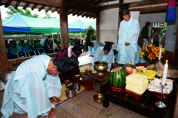 “굽어 살펴 주소서”  18일 충남 홍성군 결성면 결성동헌 형방청에서 신목제(신령스러운 나무에 제를 올리는 것)가 열리고 있다. 형방청은 조선시대 관아에서 치안업무를 담당하는 하급관리들이 묵던 곳으로 이날 행사는 결성면 문화재보호회 주최로 진행됐다.<br>연합뉴스