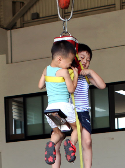 “엄마 무서워요”  전북 익산시 왕궁원광어린이집 원생들이 28일 산림청 익산산림항공관리소에서 인명구조용 장비를 체험해 보고 있다.<br>익산산림항공관리소 제공