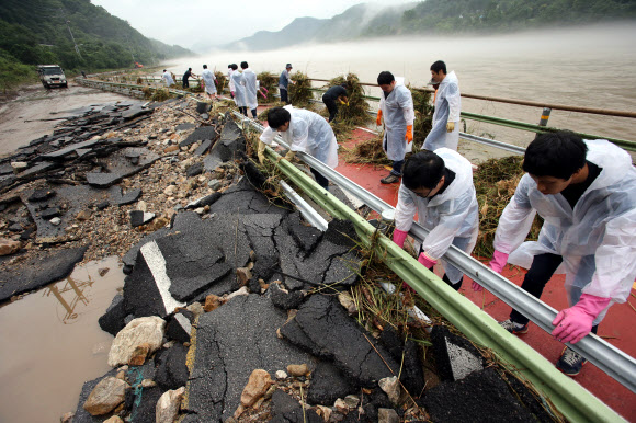 수해복구에 팔 걷은 시민들  18일 강원 춘천시에 들어서는 전력 정보기술(IT) 문화복합산단 직원들이 집중호우로 침수 피해를 입은 남산면 강촌 북한강 자전거도로를 찾아 복구활동을 펼치고 있다.<br>춘천 연합뉴스<br>