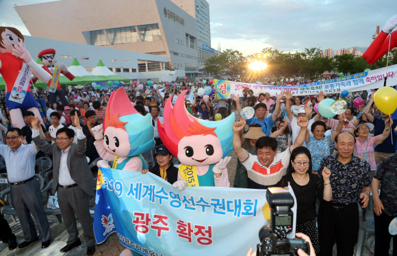 유치 성공 했지만…  19일 스페인에서 열린 국제수영연맹(FINA) 총회에서 광주광역시가 2019년 세계선수권대회 개최도시로 확정되자 광주 시민광장에 모인 시민들이 플래카드를 흔들며 기뻐하고 있다.<br>광주 연합뉴스