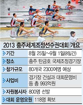 충주댐과 충주조정지댐 사이에 생긴 인공호수인 탄금호에 자리 잡은 경기장 시설은 세계 최고를 자랑한다. 총 672억원이 투입됐다. 선수들이 힘차게 물살을 가를 탄금호 국제조정경기장의 총코스 길이는 2250m다. 수역 폭은 287m에서 366m 사이다. 8개 정규 레인 108m 폭을 충분히 소화하고 남는다.