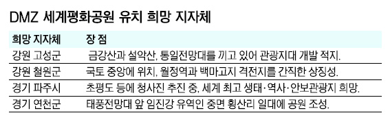 이에 대해 정부는 현재 DMZ 세계평화공원 유치전을 벌이고 있는 철원과 고성, 파주와 연천 중 1곳을 우선 조성지역으로 선정해 시범사업을 벌인 뒤 조성 지역을 점진적으로 확대하는 방안과 신청 지역 모두를 선정하는 방안 등을 종합적으로 검토하고 있는 것으로 알려졌다. 전문가들은 “현재 남북 관계가 경색돼 있어 사업을 구체화하려면 상당한 시간이 걸릴 것”이라고 전망했다.