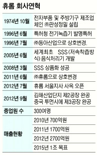 휴롬의 성공신화가 있기까지는 창업자 김영기(64) 회장의 40여년에 걸친 끈질긴 연구와 거듭된 실패가 있었다. 연세대 전기공학과를 졸업한 뒤 1974년 고향 김해에서 전자부품제조 회사인 ㈜판성정밀을 설립한 김 회장은 5년 만에 녹즙기 제조 쪽으로 바꿨다. 독자적인 기술로 제품을 만들어 세계시장으로 진출해야 살아남을 것으로 판단했고, 미래에는 건강에 대한 관심이 높아질 것을 고려했다. 김 회장은 10년이 넘는 연구 끝에 1993년 스크루 방식의 ‘오스카 녹즙기’를 개발했다. 그러나 1994년 국내 녹즙기에서 다량의 중금속이 검출됐다는 실험 결과가 나오면서 중금속 파동이 일어났다. 공업진흥청의 재시험 결과 무해한 것으로 나타났다지만 소비자들의 신뢰는 회복되지 않았다.
