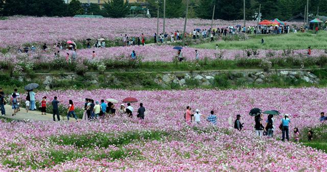 해마다 가을이면 전국에서 50만~80만명의 관광객이 찾는 경남 하동군 북천면 코스모스·메밀꽃 축제가 다음 달 21일부터 10월 16일까지 지리산 자락 농촌 마을인 북천면 직전리 일대에서 열린다. 올해로 7회째다. 직전리 일대에는 마을 앞을 지나는 경전선 철도와 국도 2호선을 사이에 두고 40여㏊에 걸쳐 코스모스와 메밀꽃 단지가 조성됐다. 전국 최대로 올해는 지난해보다 면적이 4㏊ 늘었다.