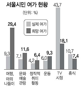서울시민은 주말과 휴일 여가 활동으로 ‘여행’을 희망하면서도 ‘TV, 디지털비디오디스크(DVD) 시청’을 가장 많이 하는 것으로 나타났다.