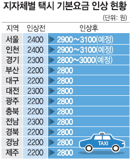 시 관계자는 “물가상승을 방지하고 시민생활 안정을 위해 인상을 미뤄오다 5년 만에 올린 것”이라고 말했다. 제주도는 4년 만인 지난달 1일부터 인상했다. 기본요금 기준으로 소형택시는 1900원에서 2200원으로, 중형택시는 2200원에서 2800원으로, 대형택시는 3300원에서 3800원으로 올렸다.