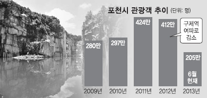 4일 시에 따르면 2010년 국립수목원과 산정호수 등 포천지역 주요 관광지를 찾은 관광객 수는 297만 3000여명이었지만 이듬해인 2011년 424만 5000명으로 처음 400만명대를 돌파했다. 경기 침체에 구제역 여파로 골프장 관광객이 급감한 지난해에도 412만 1770명이 찾을 정도로 포천의 인기는 식을 줄 몰랐다. 올해도 6월 현재 205만 5730명을 기록해 400만명이 넘어설 것으로 전망된다.