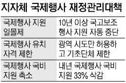 국제 행사 유치도 광역단체인 시·도에만 허용하고 기초단체인 시·군·구는 배제할 방침이다. 특히 전국 지자체가 요구한 내년도 주요 국제 행사 국비 지원금 6360억원(196건) 가운데 33%인 2098억원을 삭감할 방침이다. 정부의 이 같은 방침은 지자체들이 경쟁적으로 무분별하게 국제 행사를 유치하고 국비 지원을 요구해 재정 부담이 커졌기 때문이다.