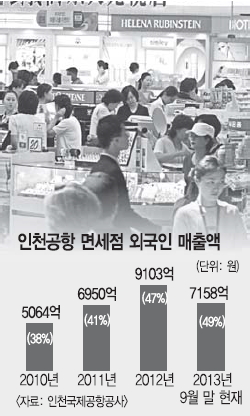 인천국제공항 면세점 매출에서 외국인이 차지하는 비율이 절반 가까운 것으로 나타났다. 인천공항 개장 초기만 해도 외국인이 사는 비율이 20%대에 머물러 본래 취지와는 달리 ‘내국인용’이라는 비판에 직면했던 면세점이 중국 관광객 대거 유입으로 반등세를 이루고 있다. 게다가 인천공항 면세점 매출액은 4년 새 64%나 늘어 국내 경기 침체와는 반대로 ‘해외여행 특수’를 톡톡히 누리고 있다.